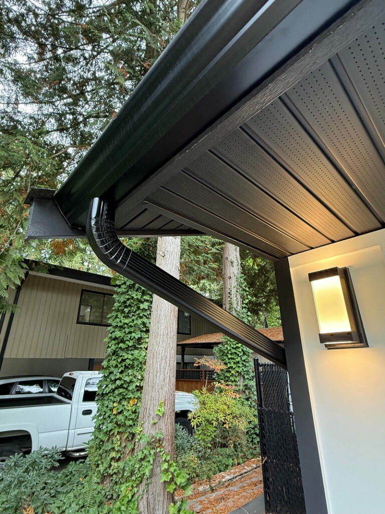 Standard 4-inch gutters are often undersized for Vancouver’s rainfall volume. Most BC homes benefit from 5-inch or 6-inch gutters, particularly on larger roof surfaces or homes surrounded by trees. Proper sizing paired with correctly angled downspouts makes the difference between a gutter system that works and one that overflows every storm.